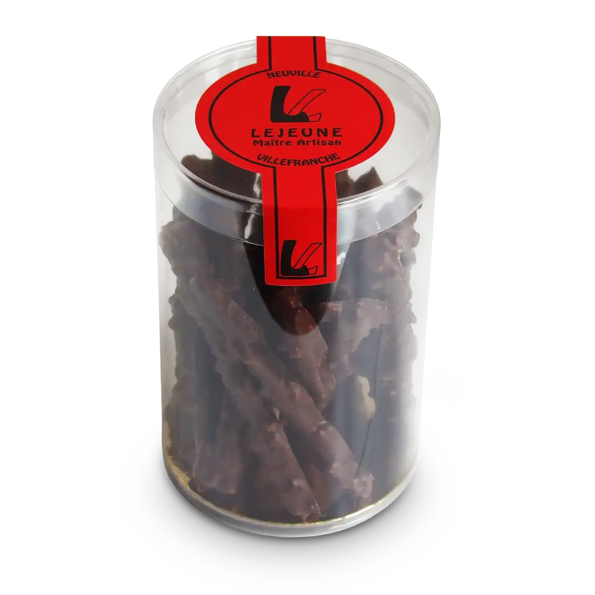 De fines écorces d’orange confites parsemées d'amandes hachées, plongées dans un chocolat noir intense. La puissance du cacao rencontre la fraîcheur du fruit, pour un équilibre parfait entre amertume et douceur.