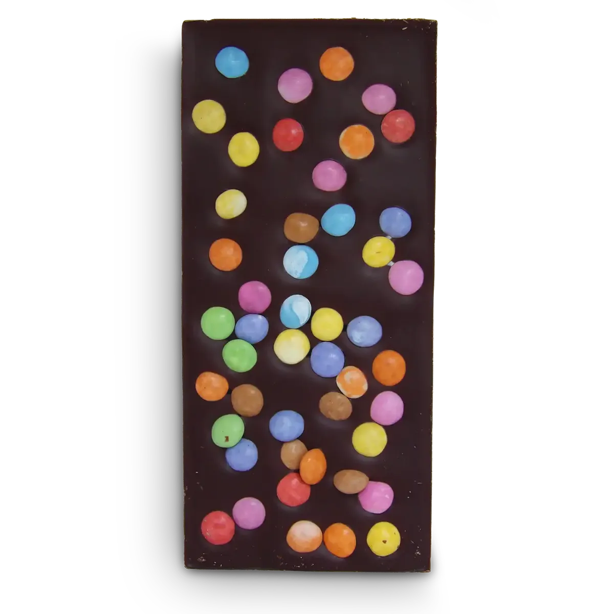 Une tablette joyeuse et colorée où la profondeur du chocolat noir rencontre le croquant sucré des Smarties. Un plaisir régressif qui séduit petits et grands.
