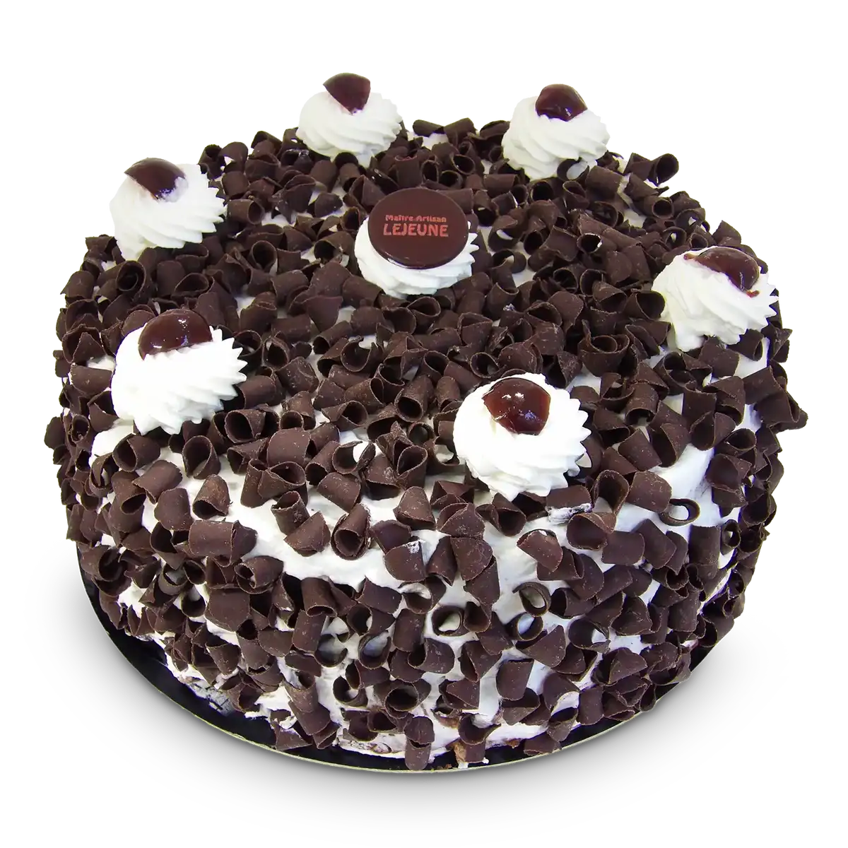Génoise moelleuse au chocolat,  mousse chocolat et mousse chantilly garnies de cerises amaréna, recouvert de copeaux de chocolat