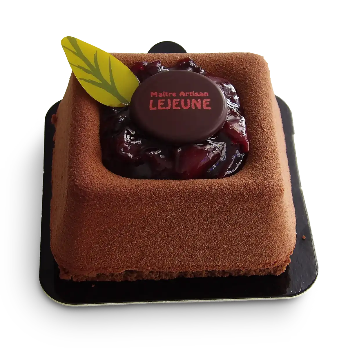 Un irrésistible mariage de textures : biscuit moelleux au chocolat et éclats de noisettes, surmonté d’une mousse intense au chocolat noir. La compotée de griottes apporte une note acidulée qui sublime la richesse du cacao.