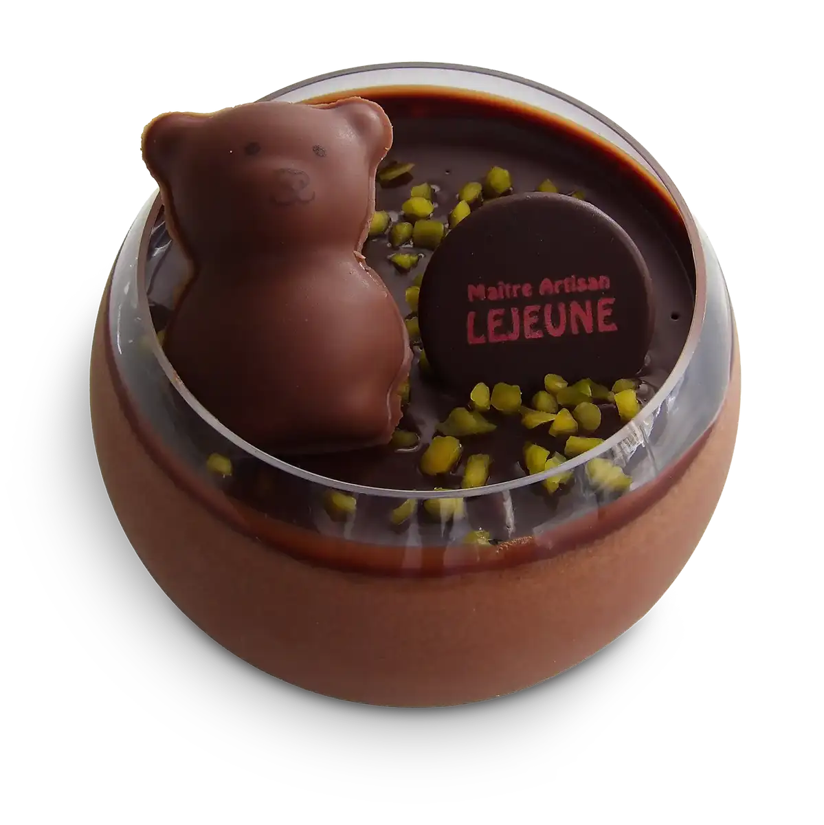 L’alliance de la pistache et du chocolat noir déclinée en couches gourmandes : croustillant, crème soyeuse et mousse intense pour un dessert tout en relief. Biscuit noisettes.