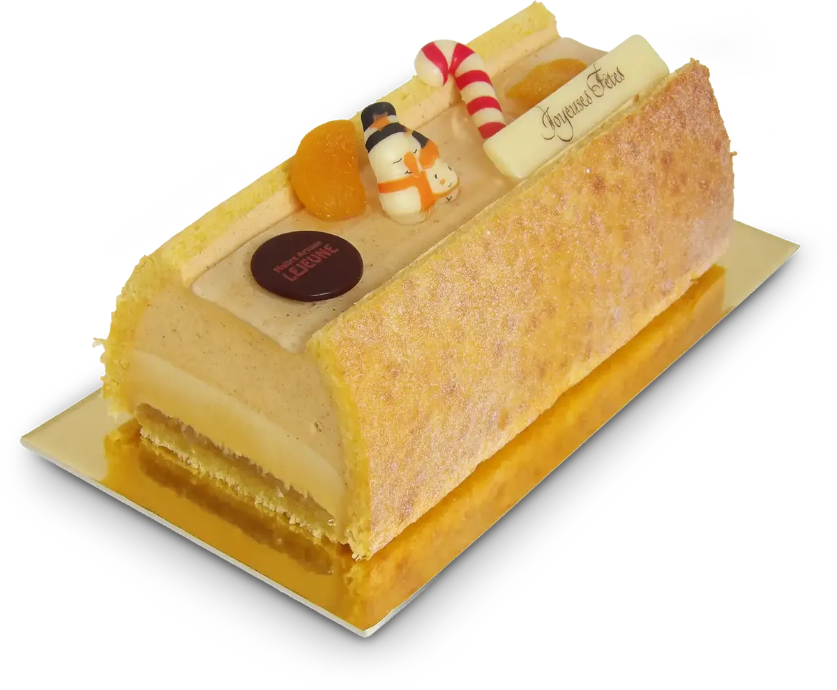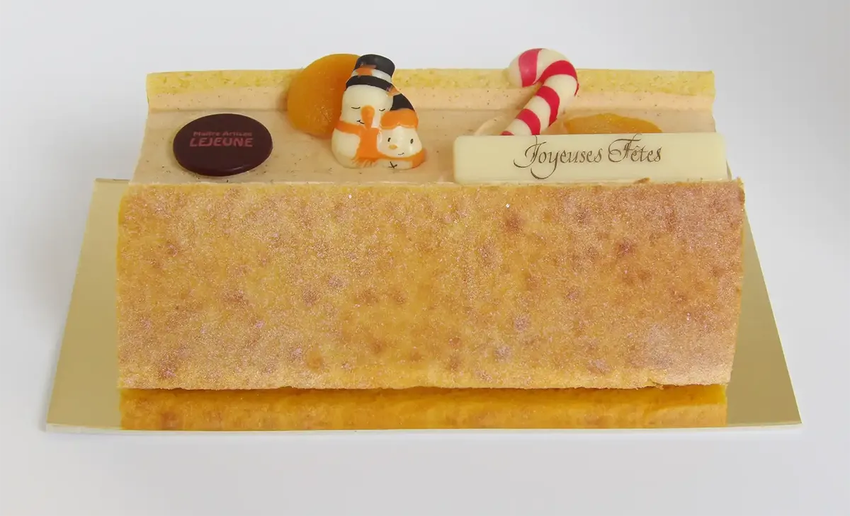 La bûche Farandole séduit par son biscuit aux amandes agrémenté d’éclats de citron. Sa mousse abricot, relevée d’une pointe de cannelle, apporte une douceur chaleureuse tandis que la compotée de citron de Menton révèle une fraîcheur éclatante. Le tout est délicatement enveloppé d’une mousse caramel gourmande.