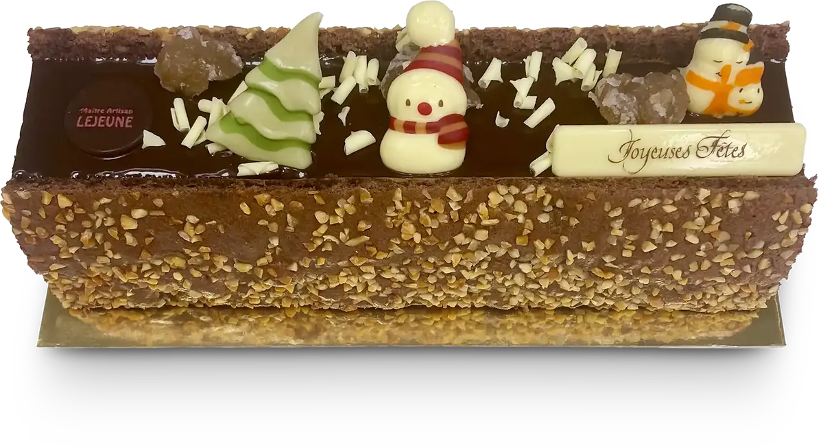 La bûche Marronie réunit un biscuit chocolat agrémenté d’amandes hachées, une mousse chocolat fondante et une mousse crème de marrons délicate. Le tout est sublimé par des éclats de marrons qui intensifient les saveurs.