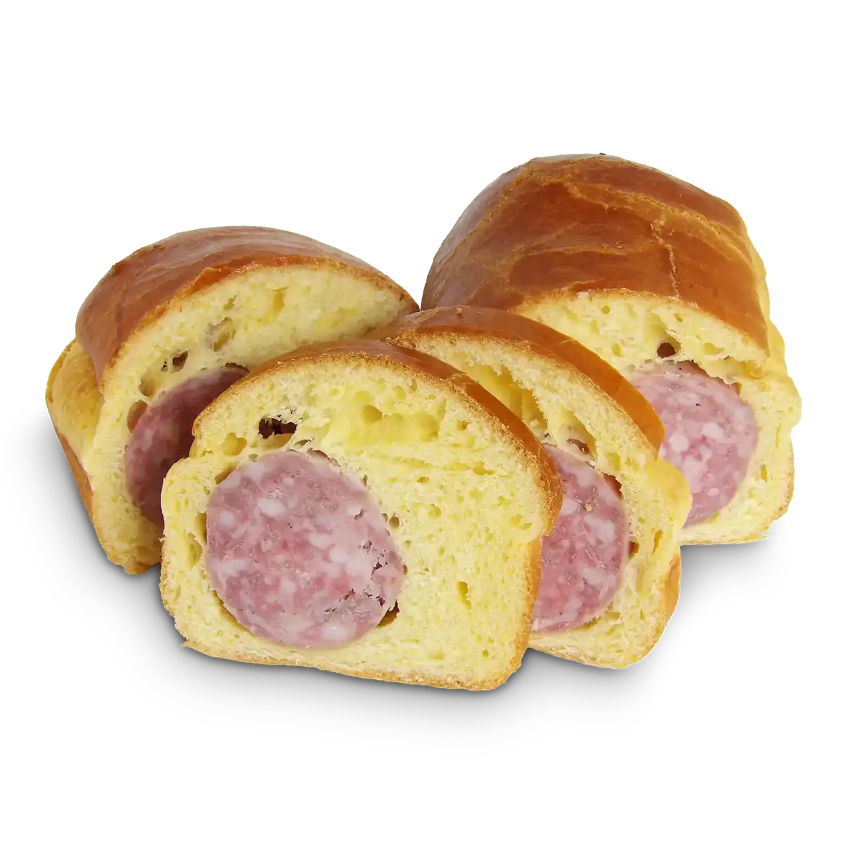 Un classique gourmand : un saucisson de qualité enveloppé dans une pâte briochée moelleuse et légèrement dorée. Idéal chaud ou tiède, pour une pause déjeuner salée savoureuse, ou un dîner léger accompagné d’une salade.